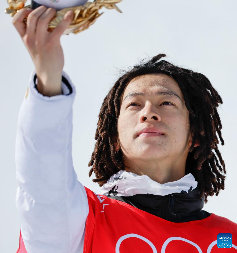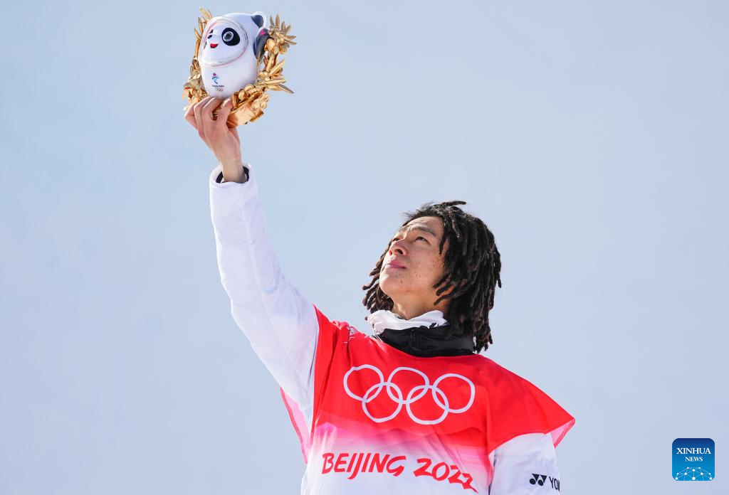 Gold medalist Hirano Ayumu of Japan reacts during the flower ceremony after the men's snowboard halfpipe final at Genting Snow Park in Zhangjiakou, north China's Hebei Province, Feb. 11, 2022. (Xinhua/Xu Chang)
