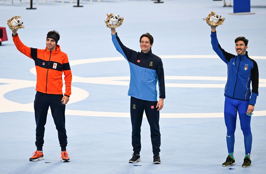 Nils van der Poel of Sweden (C), Patrick Roest of the Netherlands (L) and Davide Ghiotto of Italy salute at the flower ceremony of the speed skating men's 10000m of Beijing 2022 Winter Olympics, Feb. 11, 2022. (Xinhua/Wang Fei)