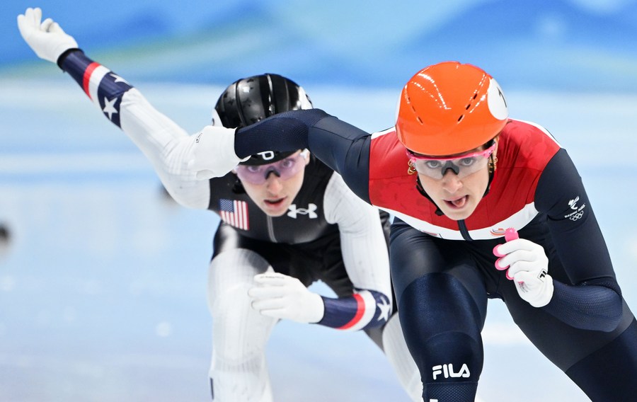 Suzanne Schulting (R) of the Netherlands competes in the women's 1,000m final of short track speed skating at Capital Indoor Stadium in Beijing, Feb. 11, 2022. (Xinhua/Li Yibo)