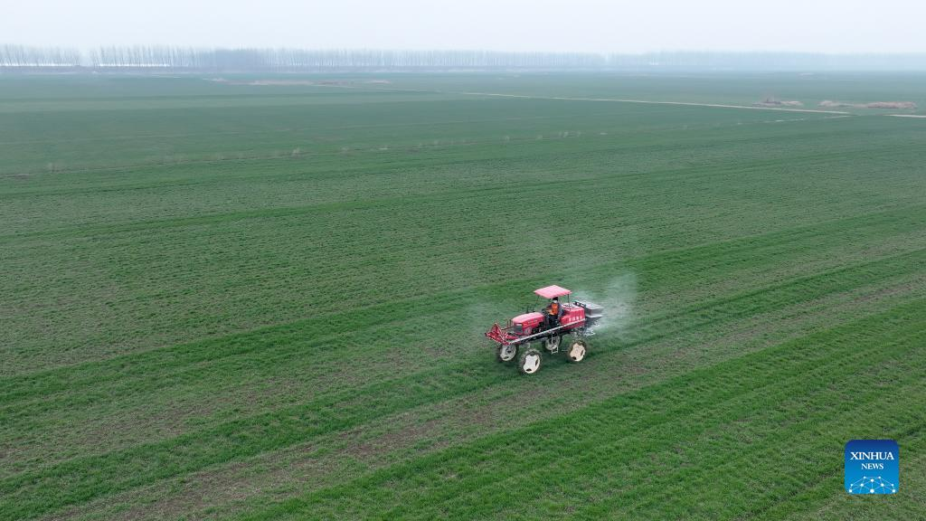 Aerial photo taken on Feb. 11, 2022 shows a farm machine fertilizing the fields in Sanhe Town of Hongze District, Huai'an city, east China's Jiangsu Province. (Photo by Wan Zhen/Xinhua)
