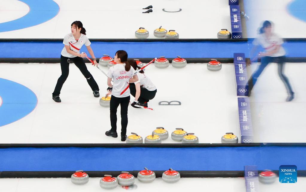 Athletes of Japan compete during the Curling Women's Round Robin Session 3 of the Beijing 2022 Winter Olympics between Canada and Japan at the National Aquatics Centre in Beijing, capital of China, Feb. 11, 2022. (Xinhua/Liu Xu)