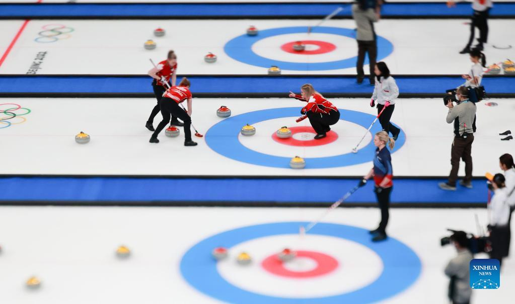 Athletes of Canada (C) compete during the Curling Women's Round Robin Session 3 of the Beijing 2022 Winter Olympics between Canada and Japan at the National Aquatics Centre in Beijing, capital of China, Feb. 11, 2022. (Xinhua/Liu Xu)