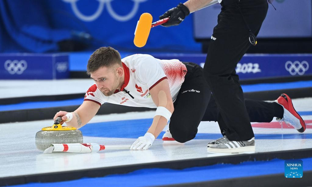 Mads Noergaard of Denmark competes during the Curling Men's Round Robin Session 4 of the Beijing 2022 Winter Olympics between ROC and Denmark at the National Aquatics Centre in Beijing, capital of China, Feb. 11, 2022. (Xinhua/Huang Xiaobang)