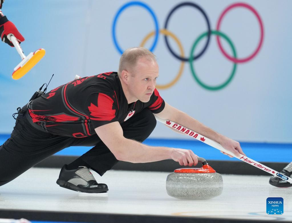 Mark Nichols of Canada competes during the Curling Men's Round Robin Session 4 of the Beijing 2022 Winter Olympics between Canada and Britain at the National Aquatics Centre in Beijing, capital of China, Feb. 11, 2022. (Xinhua/Zhou Mi)