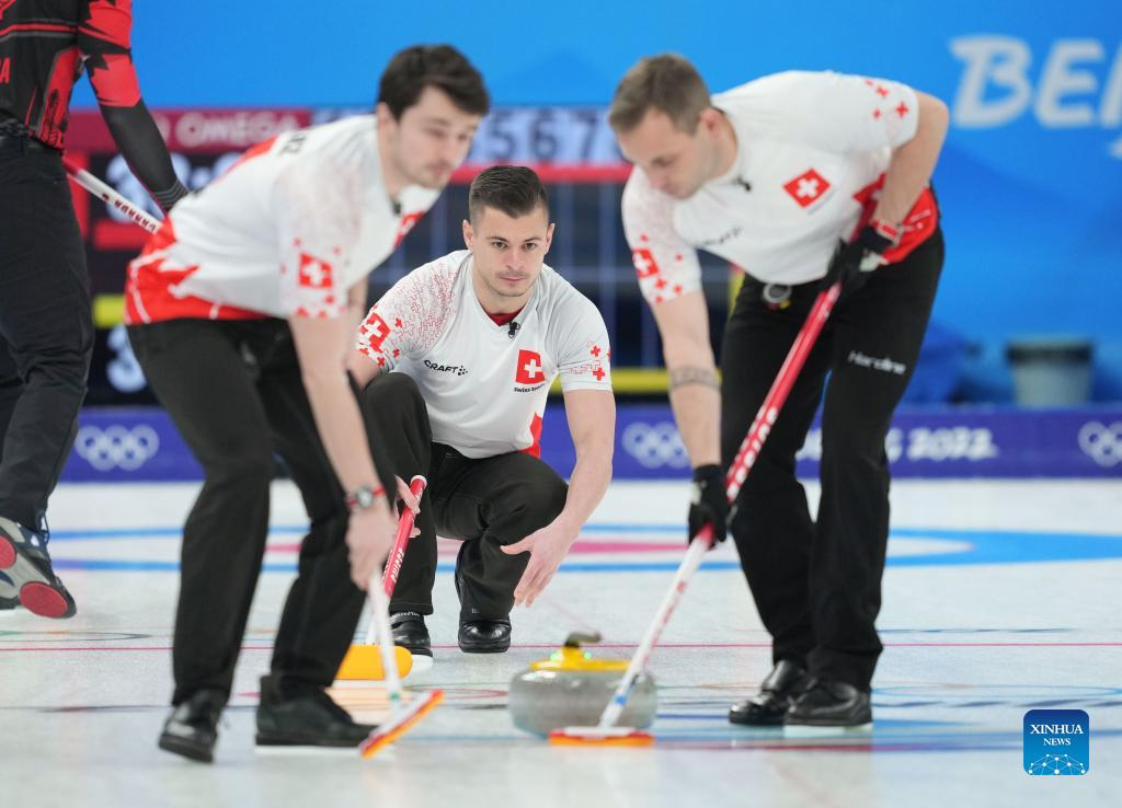 Valentin Tanner (C) of Switzerland competes during the Curling Men's Round Robin Session 4 of the Beijing 2022 Winter Olympics between Canada and Britain at the National Aquatics Centre in Beijing, capital of China, Feb. 11, 2022. (Xinhua/Zhou Mi)
