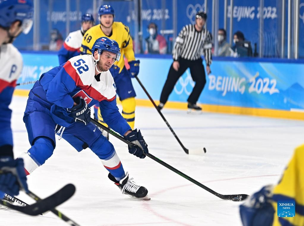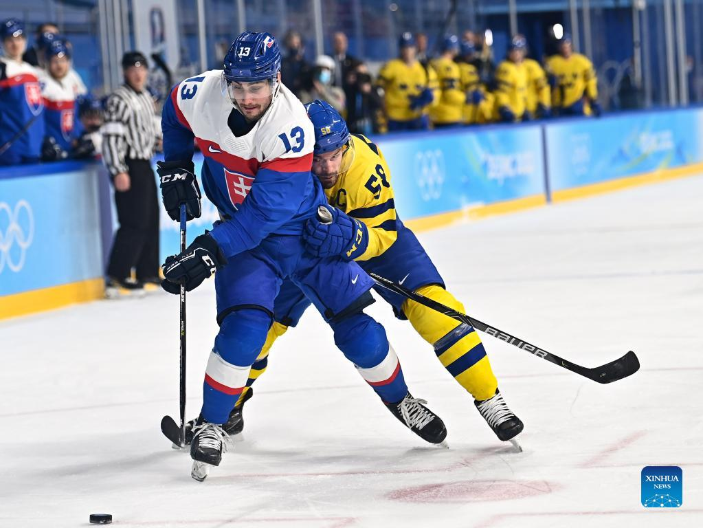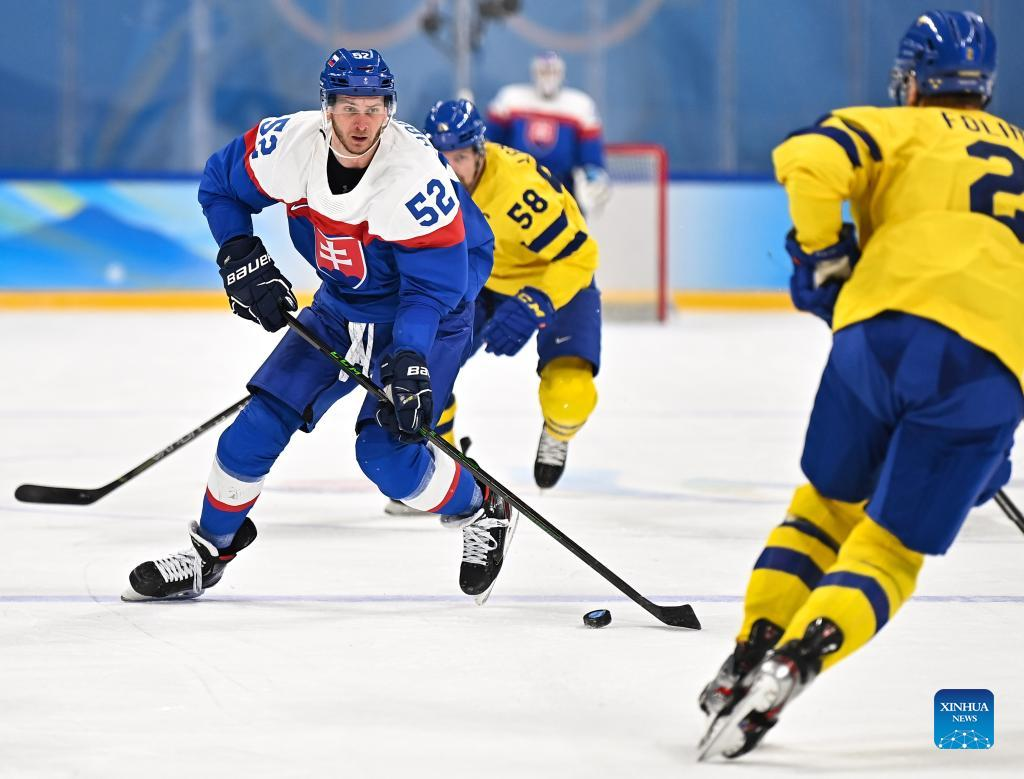 Michal Cajkovsky (L) of Slovakia tries to control the puck during the ice hockey men's preliminary round Group C match between Sweden and Slovakia at Wukesong Sports Centre in Beijing, capital of China, Feb. 11, 2022. (Xinhua/Song Yanhua)