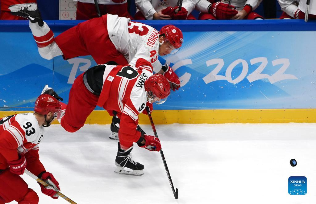 Frederik Storm (C) of Denmark vies with Damir Sharipzyanov (top) of ROC during the men's ice hockey preliminary round Group B match between Denmark and ROC at the National Indoor Stadium in Beijing, China, Feb. 11, 2022. (Xinhua/Li He)