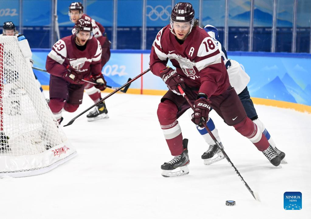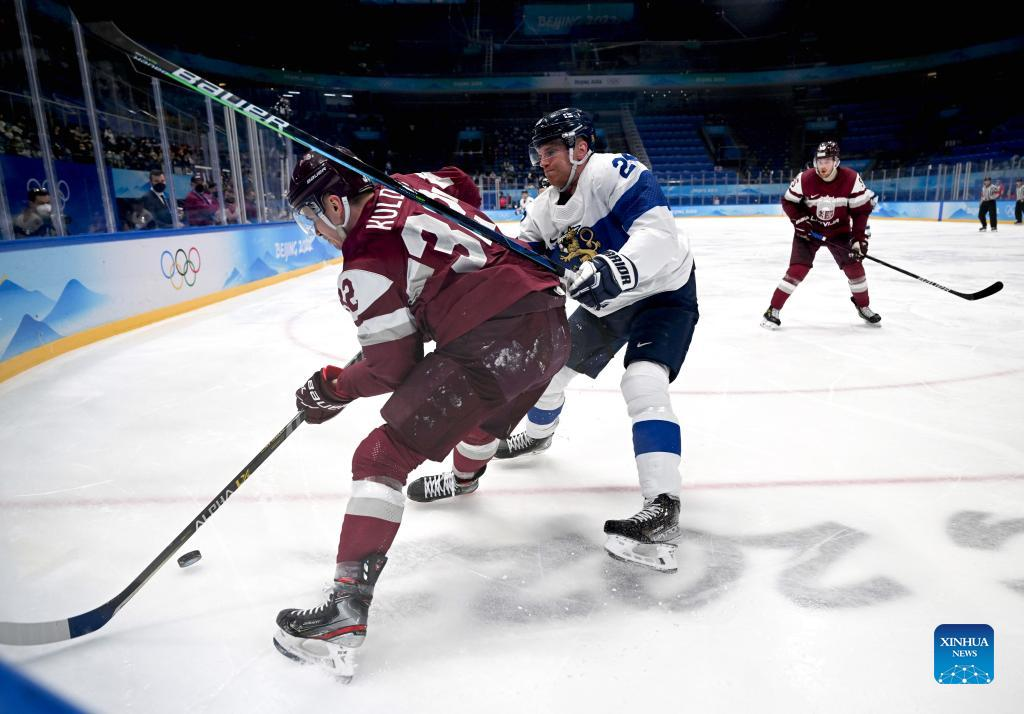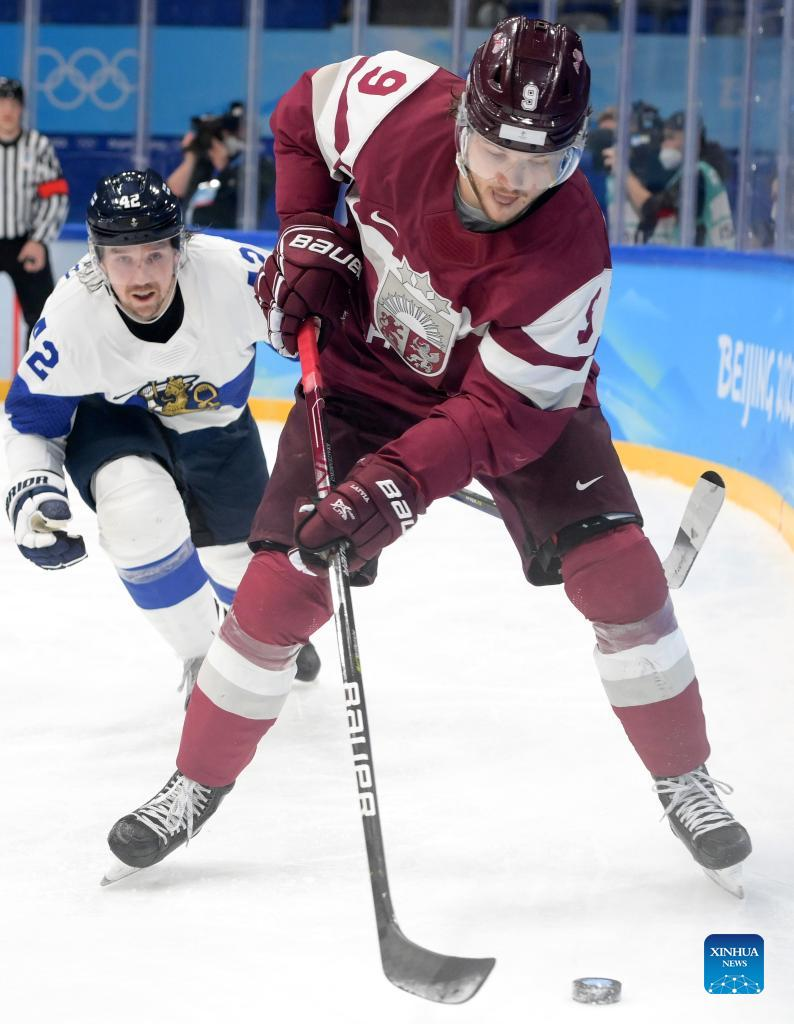 (220212) -- BEIJING, Feb. 11, 2022 (Xinhua) -- Janis Jaks (2nd R) of Latvia competes during the ice hockey men's preliminary round Group C match between Latvia and Finland at National Indoor Stadium in Beijing, capital of China, Feb. 11, 2022. (Xinhua/Li An)
