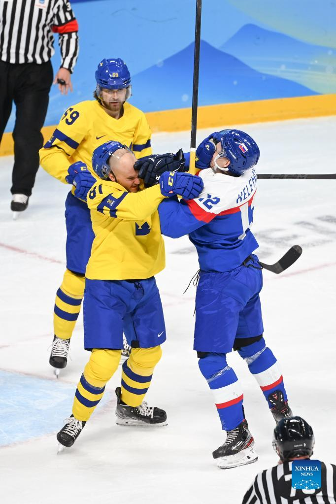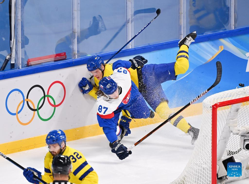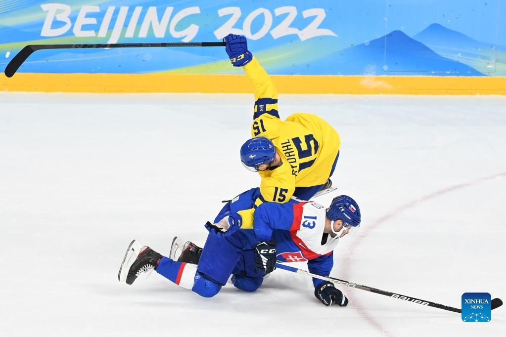 Theodor Lennstrom (C) of Sweden and Milos Kelemen (R) of Slovakia clash during the ice hockey men's preliminary round Group C match between Sweden and Slovakia at Wukesong Sports Centre in Beijing, capital of China, Feb. 11, 2022. (Xinhua/Huang Zongzhi)