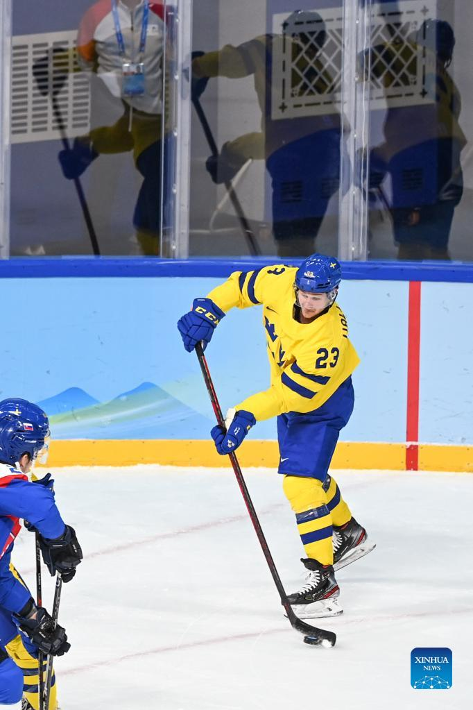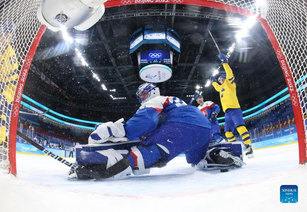 Lukas Bengtsson (C) of Sweden vies for the puck during the ice hockey men's preliminary round Group C match between Sweden and Slovakia at Wukesong Sports Centre in Beijing, capital of China, Feb. 11, 2022. (Xinhua/Song Yanhua)