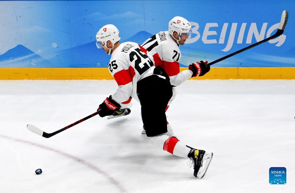 Athletes compete during the ice hockey men's preliminary round Group B match between the Czech Republic and Switzerland at National Indoor Stadium in Beijing, capital of China, Feb. 11, 2022. (Xinhua/Liu Xiao)
