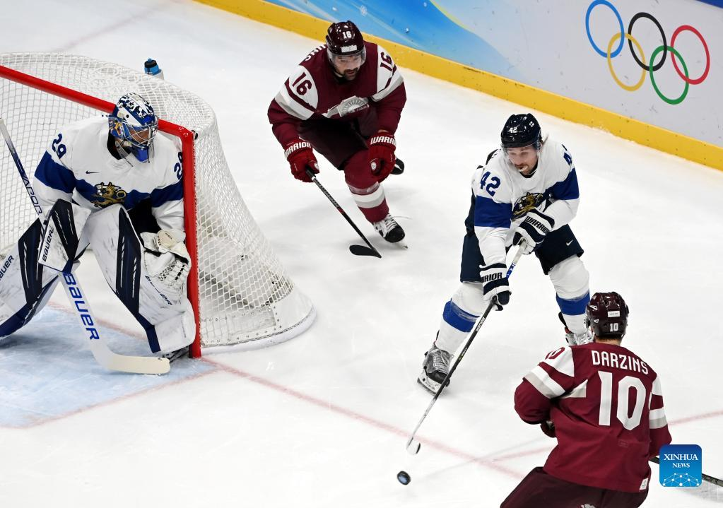 Sami Vatanen (2nd R) of Finland competes during the ice hockey men's preliminary round Group C match between Latvia and Finland at National Indoor Stadium in Beijing, capital of China, Feb. 11, 2022. (Xinhua/Li Ziheng)