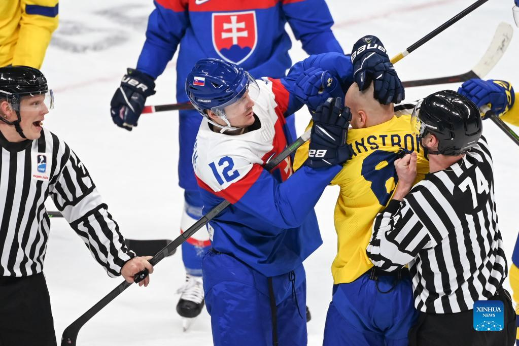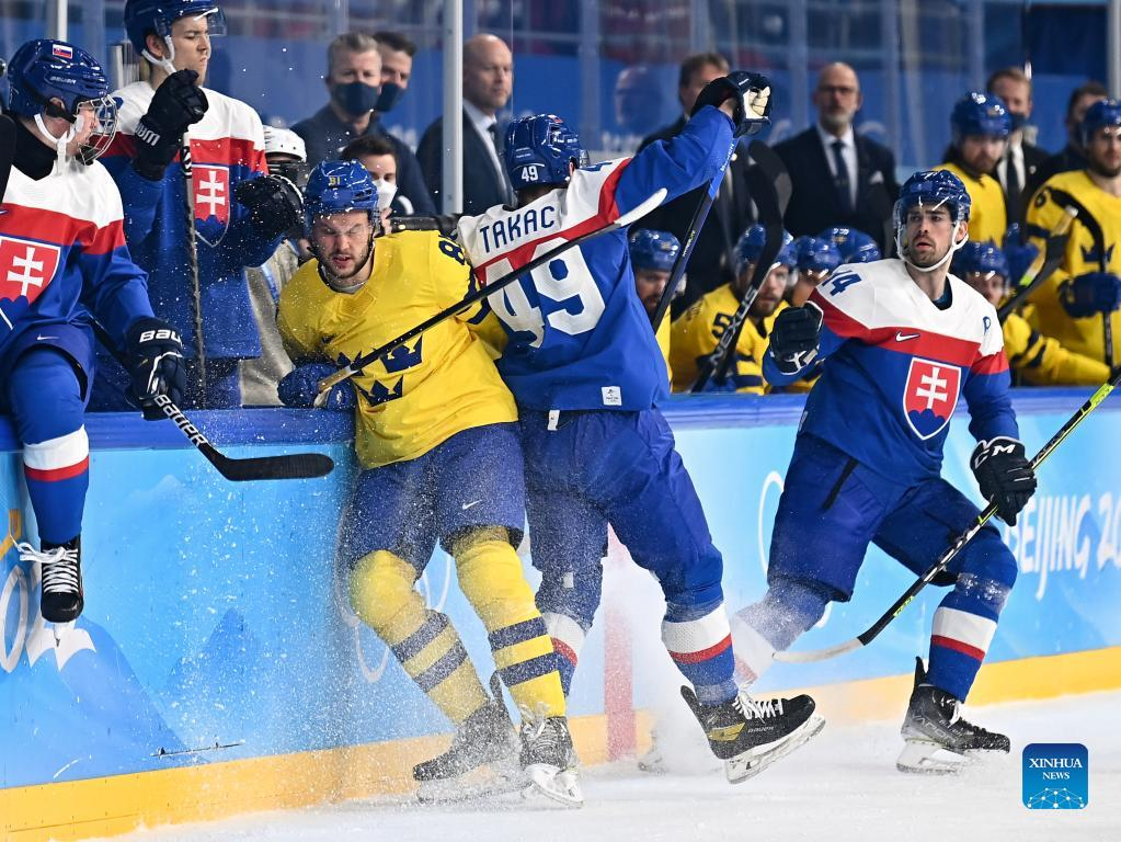 Theodor Lennstrom (L) of Sweden clashes with Samuel Takac (C) of Slovakia during the ice hockey men's preliminary round Group C match between Sweden and Slovakia at Wukesong Sports Centre in Beijing, capital of China, Feb. 11, 2022. (Xinhua/Song Yanhua)