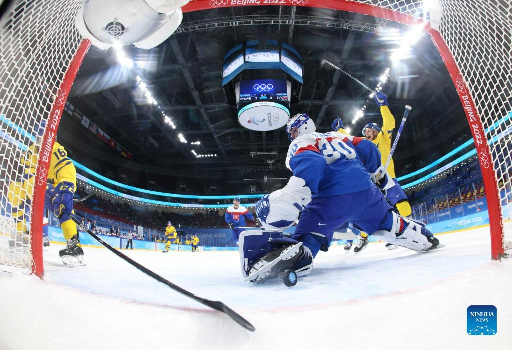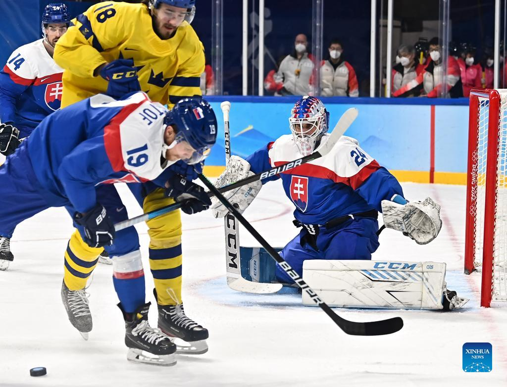 Goalkeeper Patrik Rybar (1st R) of Slovakia tries to make a save during the ice hockey men's preliminary round Group C match between Sweden and Slovakia at Wukesong Sports Centre in Beijing, capital of China, Feb. 11, 2022. (Xinhua/Song Yanhua)