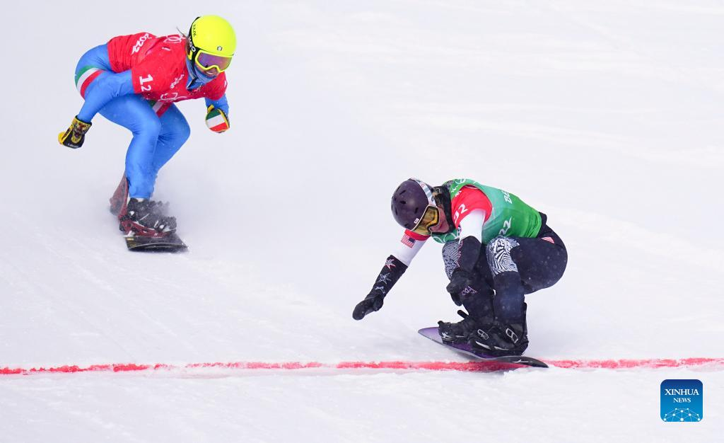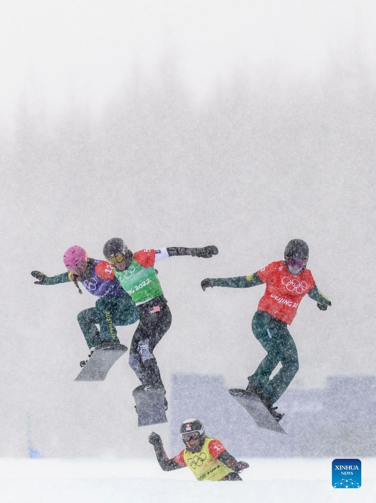 Lindsey Jacobellis (2nd L) of the United States competes during the mixed team snowboard cross quaterfinals of Beijing 2022 Winter Olympics at Genting Snow Park, in Zhangjiakou, north China's Hebei Province, Feb. 12, 2022. (Xinhua/Fei Maohua)