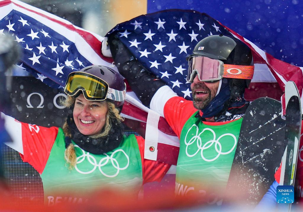 Nick Baumgartner (R) and Lindsey Jacobellis of the United States pose for photos after the mixed team snowboard cross final at Geting Snow Park in Zhangjiakou, north China's Hebei Province, Feb. 12, 2022.