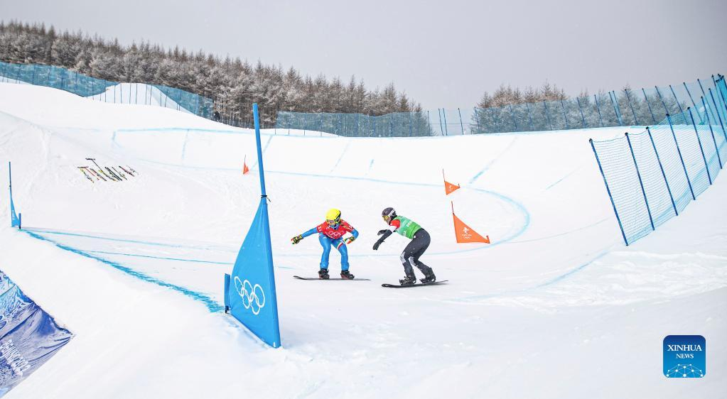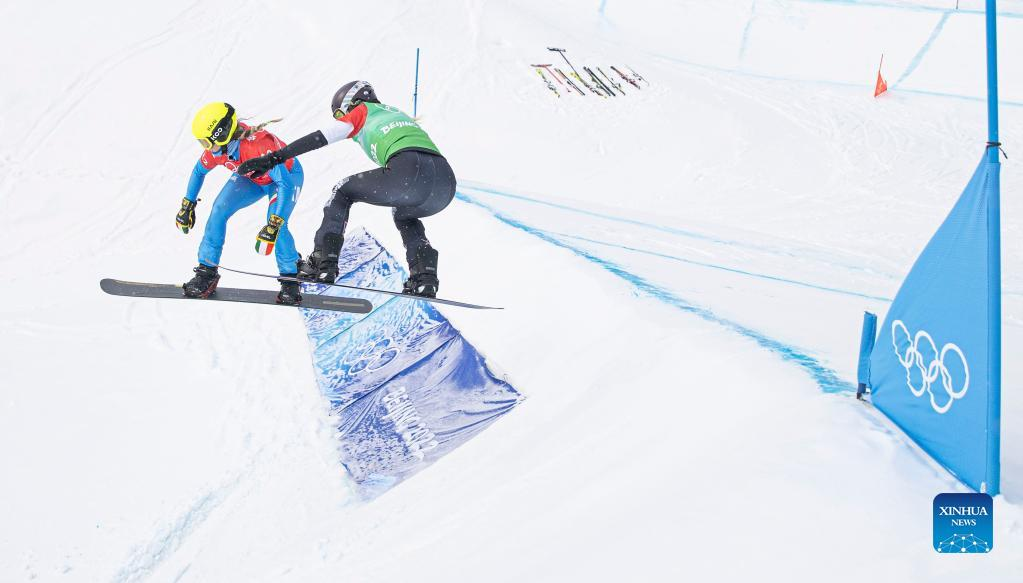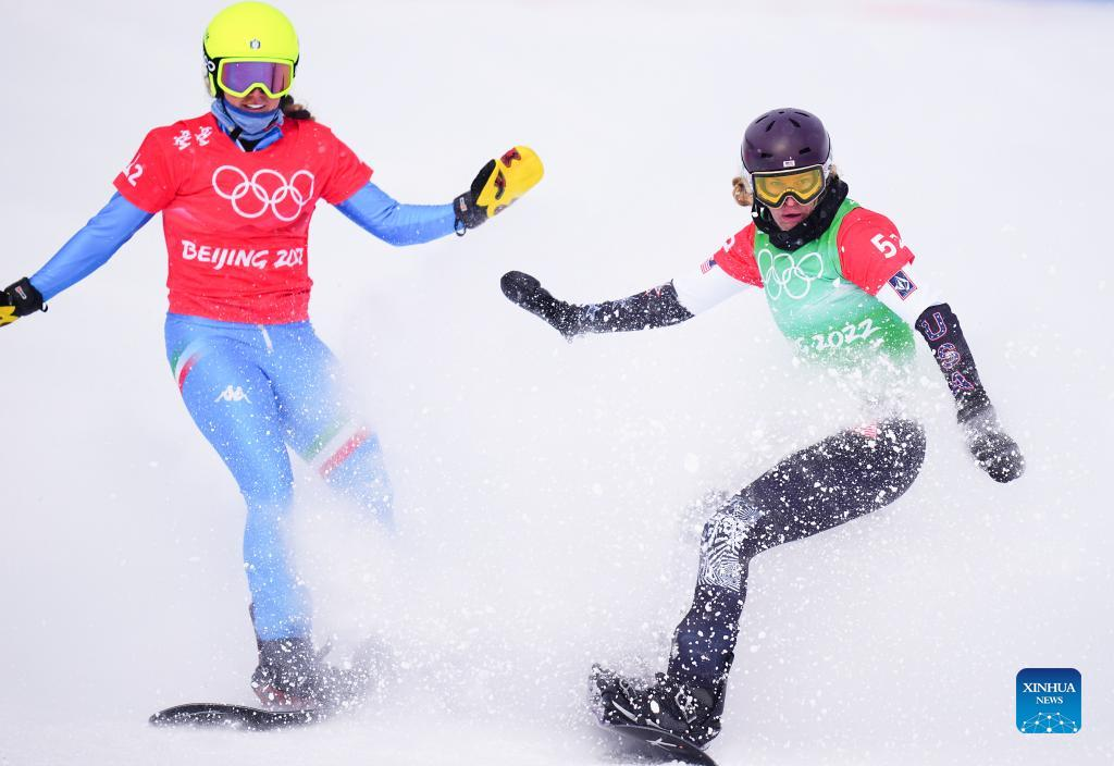 Lindsey Jacobellis (R) of the United States and Michela Moioli of Italy compete during the mixed team snowboard cross finals at Genting Snow Park in Zhangjiakou, north China's Hebei Province, Feb. 12, 2022. (Xinhua/Wu Zhuang)