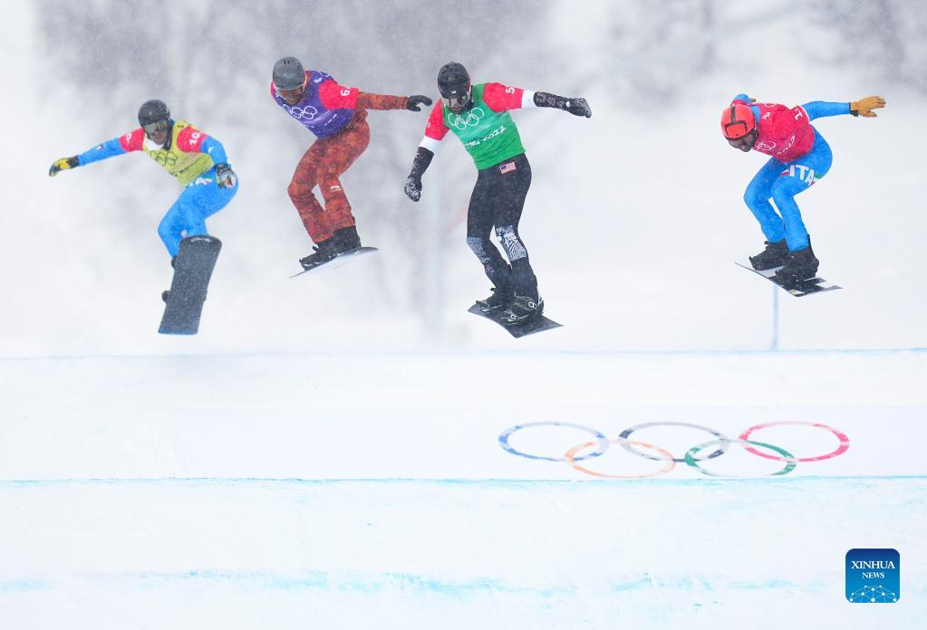 (R to L) Omar Visintin of Italy, Nick Baumgartner of the United States, Eliot Grondin of Canada and Lorenzo Sommariva of Italy compete during the mixed team snowboard cross finals at Genting Snow Park in Zhangjiakou, north China's Hebei Province, Feb. 12, 2022. (Xinhua/Xu Chang)