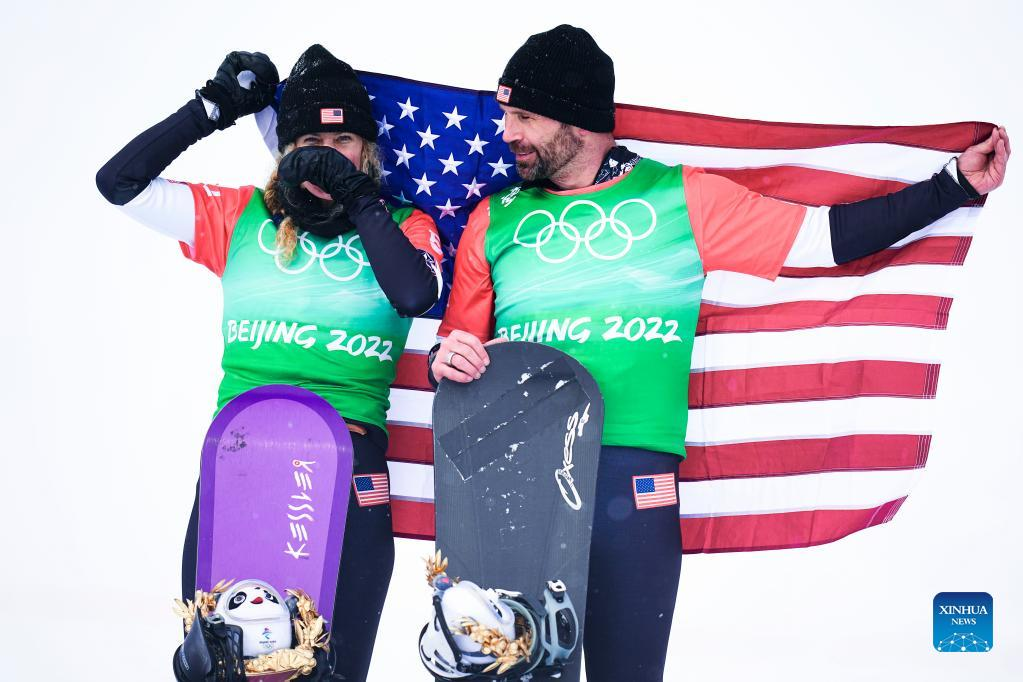Nick Baumgartner (R) and Lindsey Jacobellis of the United States attend the flower ceremony after the mixed team snowboard cross final at Geting Snow Park in Zhangjiakou, north China's Hebei Province, Feb. 12, 2022. (Xinhua/Xu Chang)