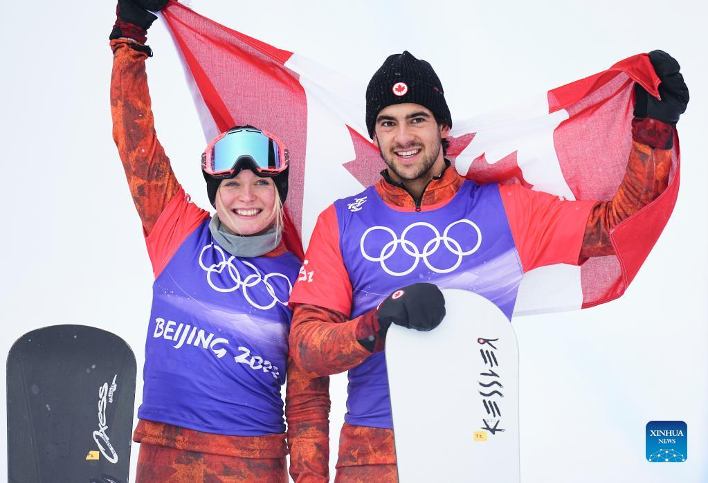 Eliot Grondin (R) and Meryeta Odine of Canada pose for photos during the flower ceremony of the mixed team snowboard cross finals at Genting Snow Park in Zhangjiakou, north China's Hebei Province, Feb. 12, 2022. (Xinhua/Xu Chang)