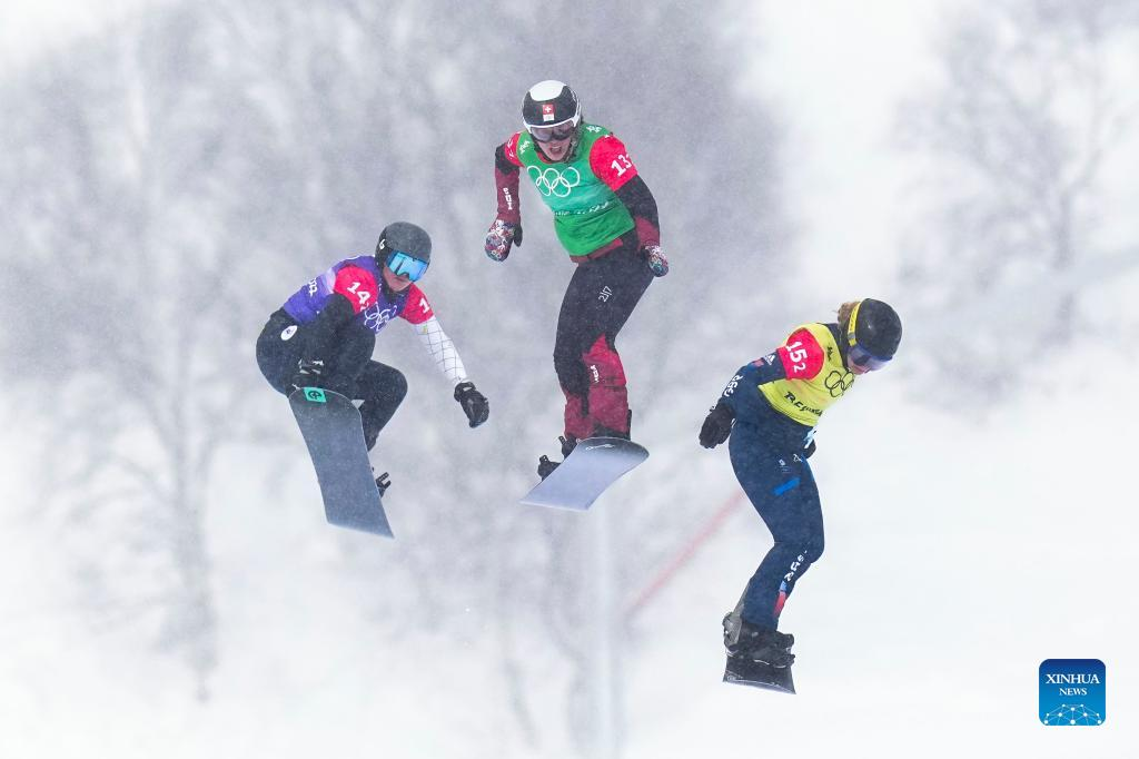 Charlotte Bankes (R) of Great Britain, Sophie Hediger (C) of Switzerland and Kristina Paul of ROC compete during the mixed team snowboard cross finals at Genting Snow Park in Zhangjiakou, north China's Hebei Province, Feb. 12, 2022. (Xinhua/Xu Chang)