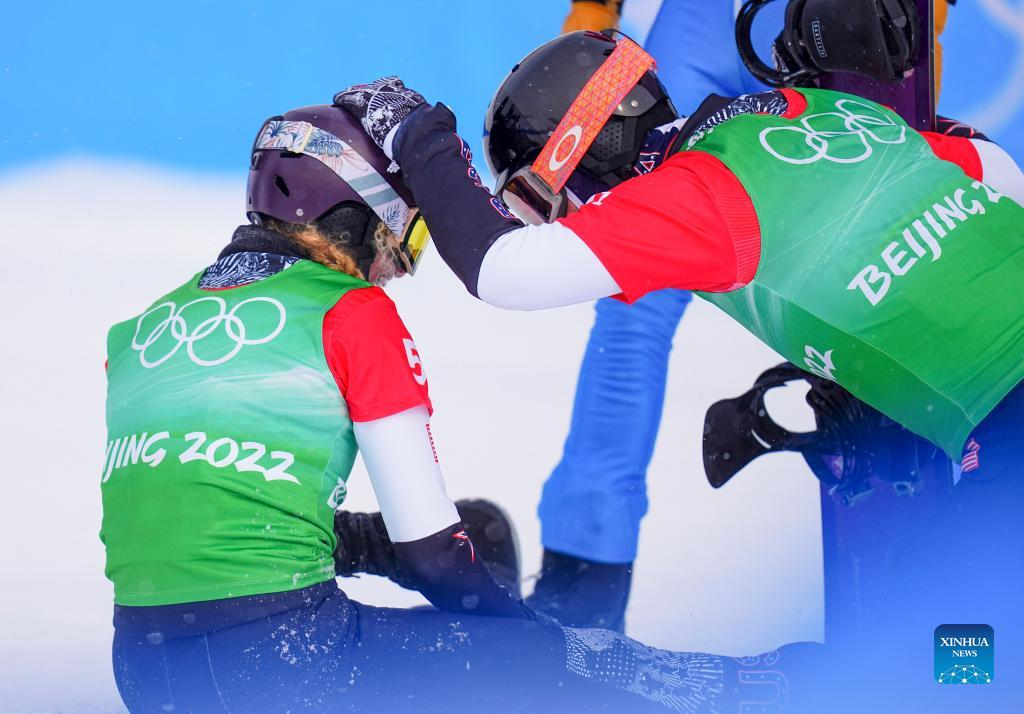 Lindsey Jacobellis (front L) and Nick Baumgartner (front R) of the United States react after the mixed team snowboard cross finals at Genting Snow Park in Zhangjiakou, north China's Hebei Province, Feb. 12, 2022. (Xinhua/Xu Chang)
