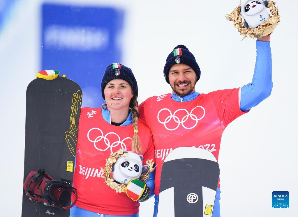 Omar Visintin (R) and Michela Moioli of Italy pose for photos during the flower ceremony of the mixed team snowboard cross finals at Genting Snow Park in Zhangjiakou, north China's Hebei Province, Feb. 12, 2022. (Xinhua/Xu Chang)