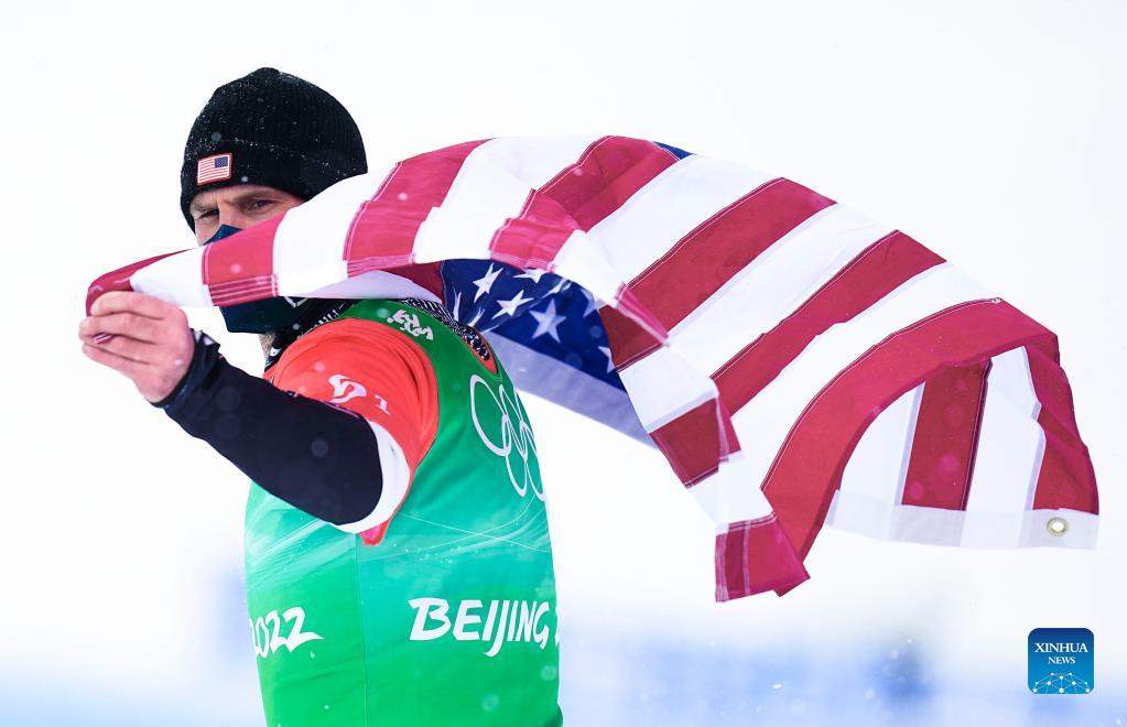Nick Baumgartner of the United States attends the flower ceremony after the mixed team snowboard cross final at Geting Snow Park in Zhangjiakou, north China's Hebei Province, Feb. 12, 2022. (Xinhua/Xu Chang)