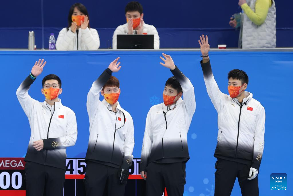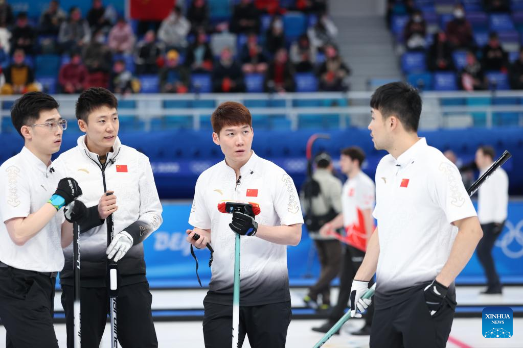 Athletes of China react during curling men's robin session 5 of Beijing 2022 Winter Olympics between China and Italy at National Aquatics Centre in Beijing, capital of China, Feb. 12, 2022. (Xinhua/Yang Lei)