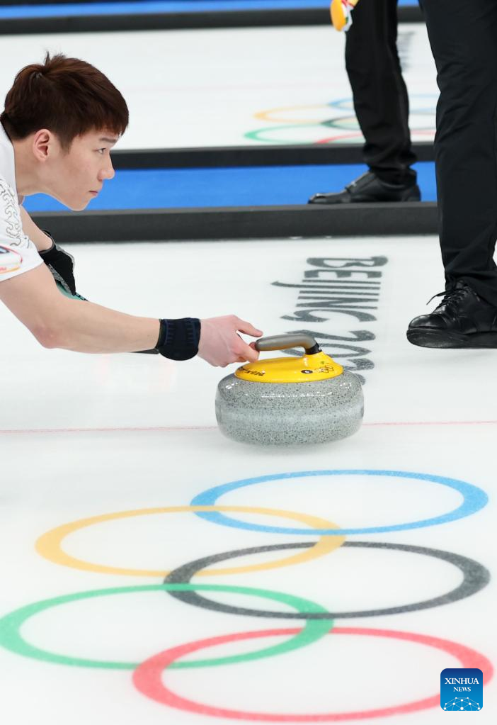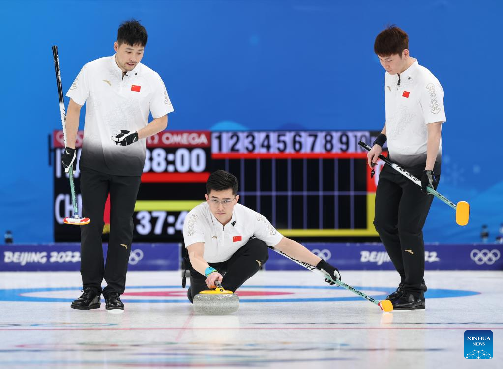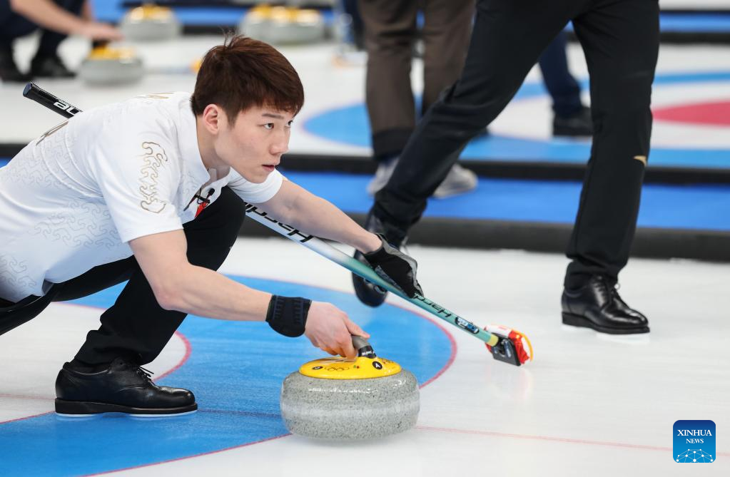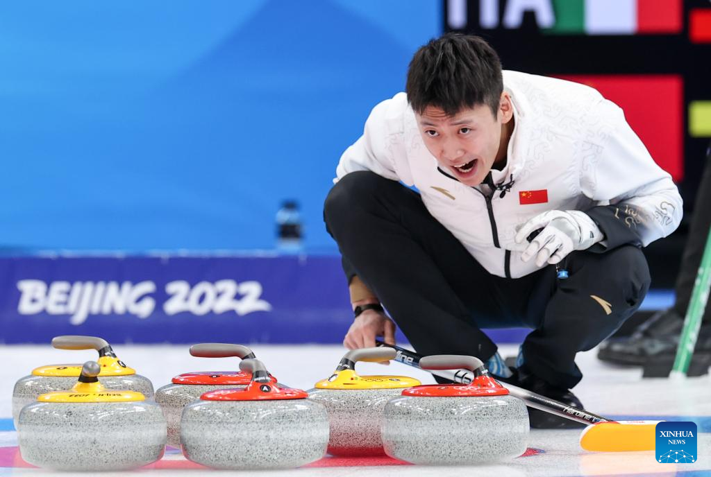 Xu Jingtao (C) of China competes during curling men's robin session 5 of Beijing 2022 Winter Olympics between China and Italy at National Aquatics Centre in Beijing, capital of China, Feb. 12, 2022. (Xinhua/Yang Lei)