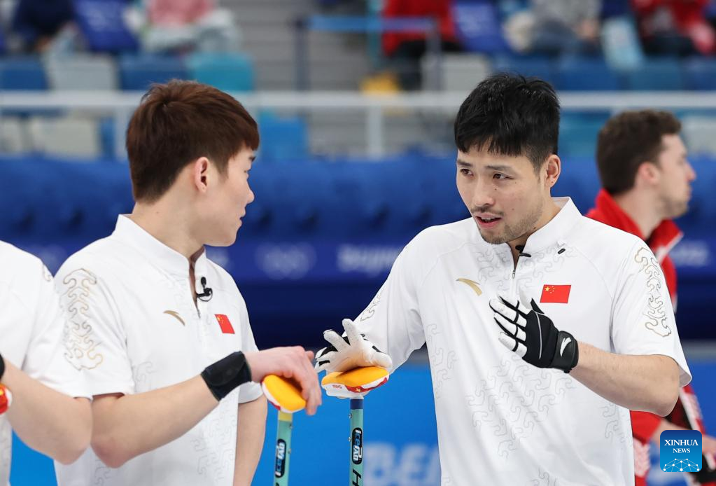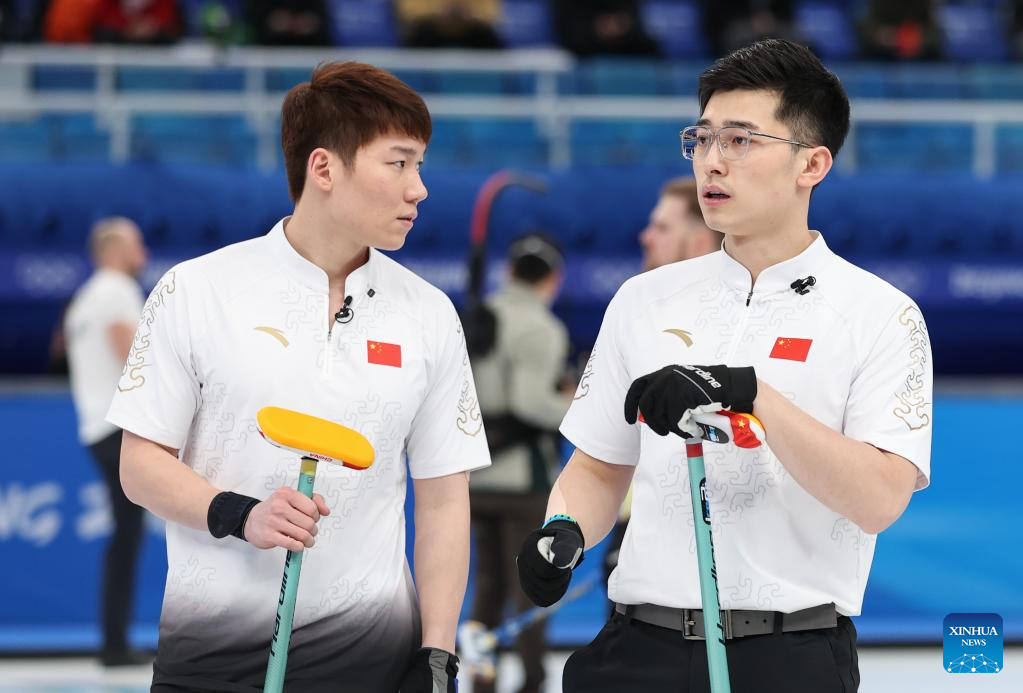Zou Qiang (R) of China communicates with his teammate during curling men's robin session 5 of Beijing 2022 Winter Olympics between China and Italy at National Aquatics Centre in Beijing, capital of China, Feb. 12, 2022. (Xinhua/Yang Lei)