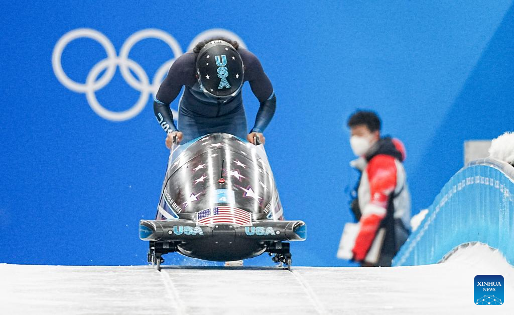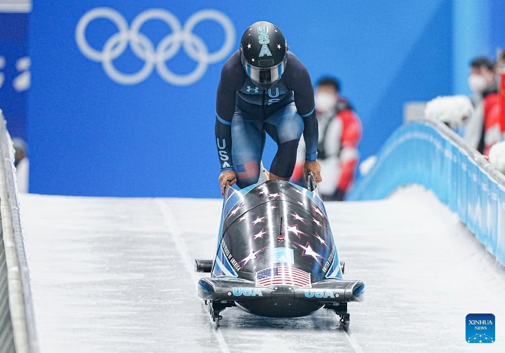 Elana Meyers Taylor of the United States competes during the bobsleigh women's monobob heat at National Sliding Centre in Yanqing District, Beijing, capital of China, Feb. 13, 2022. (Xinhua/Jiang Wenyao)