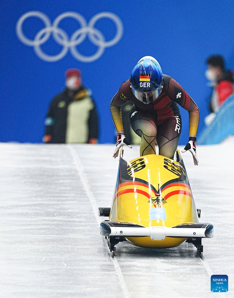 Laura Nolte of Germany competes during the bobsleigh women's monobob heat at National Sliding Centre in Yanqing District, Beijing, capital of China, Feb. 13, 2022. (Xinhua/Jiang Wenyao)