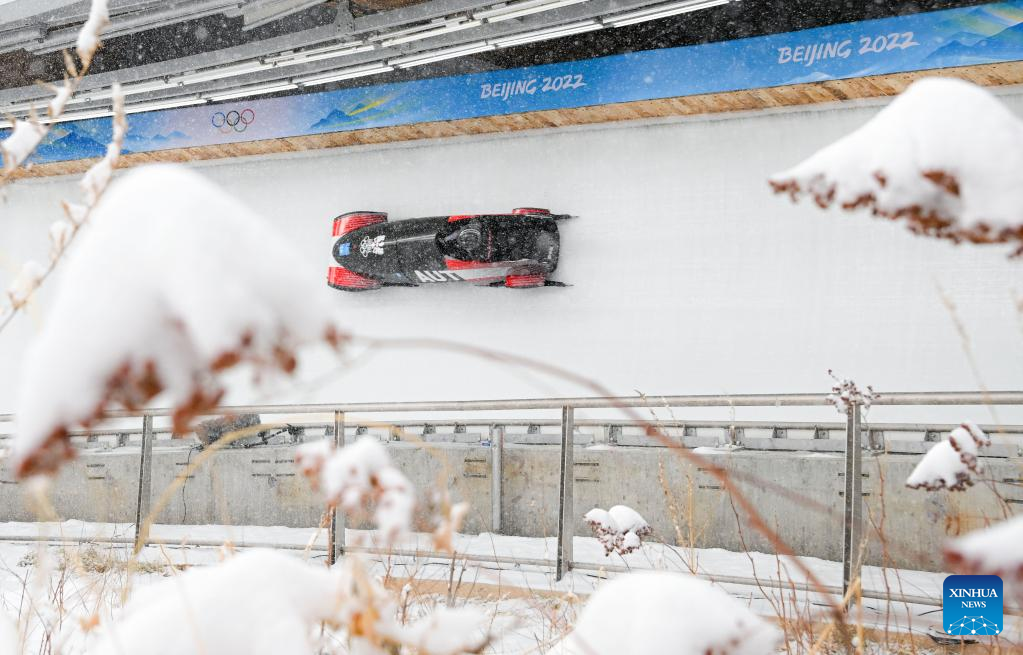 Katrin Beierl of Austria competes during the bobsleigh women's monobob heat at National Sliding Centre in Yanqing District, Beijing, capital of China, Feb. 13, 2022. (Xinhua/Jiang Wenyao)
