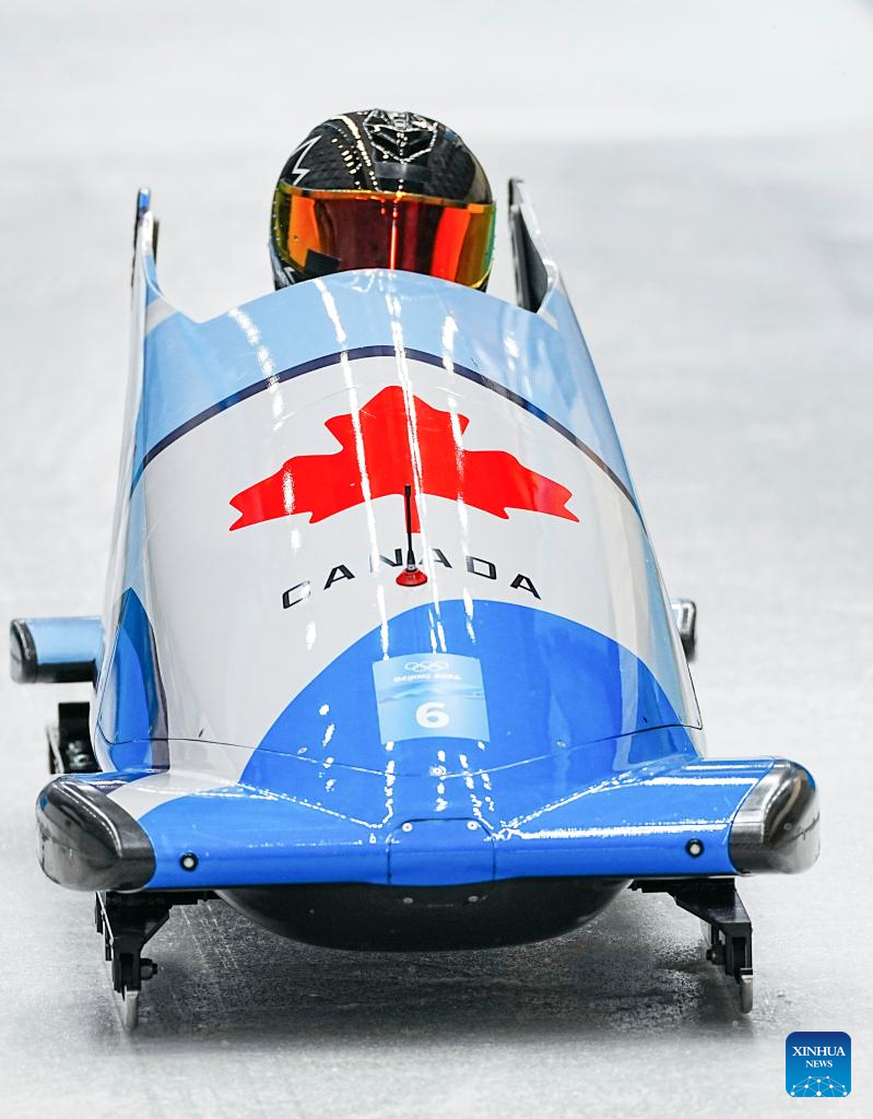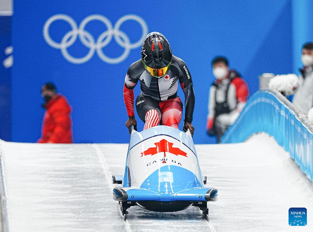 Cynthia Appiah of Canada competes during the bobsleigh women's monobob heat at National Sliding Centre in Yanqing District, Beijing, capital of China, Feb. 13, 2022. (Xinhua/Jiang Wenyao)