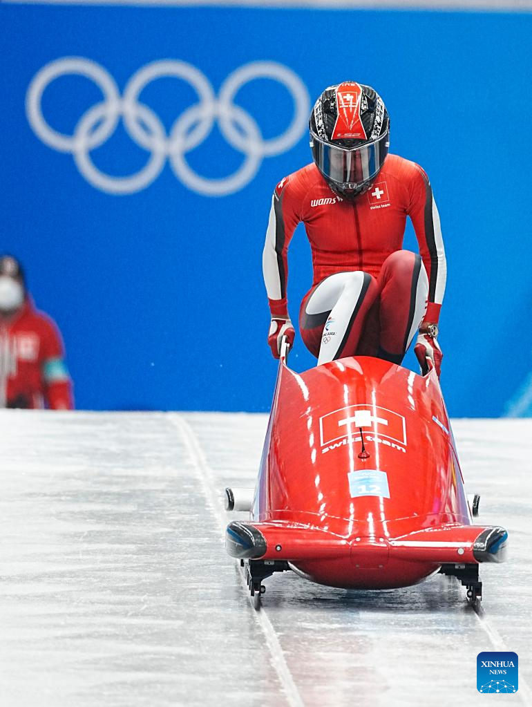 Melanie Hasler of Switzerland competes during the bobsleigh women's monobob heat at National Sliding Centre in Yanqing District, Beijing, capital of China, Feb. 13, 2022. (Xinhua/Jiang Wenyao)