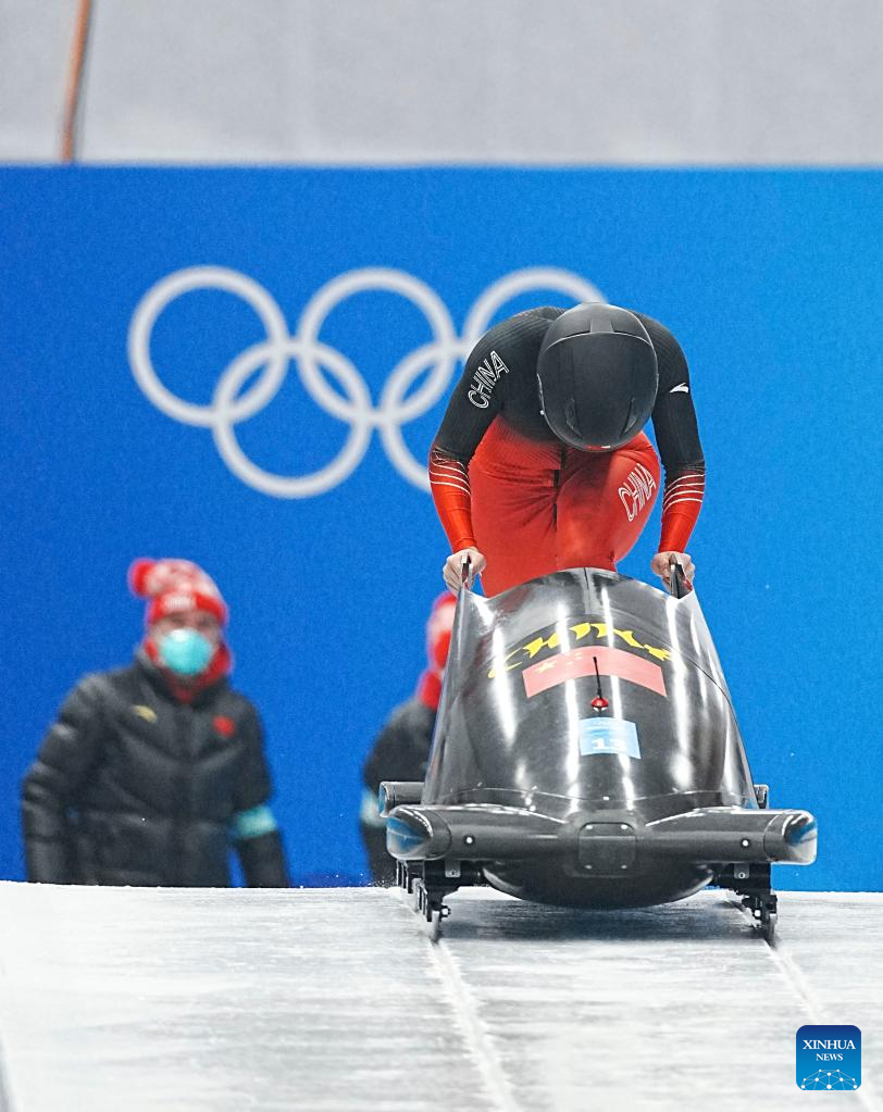 Ying Qing of China competes during the bobsleigh women's monobob heat at National Sliding Centre in Yanqing District, Beijing, capital of China, Feb. 13, 2022. (Xinhua/Jiang Wenyao)