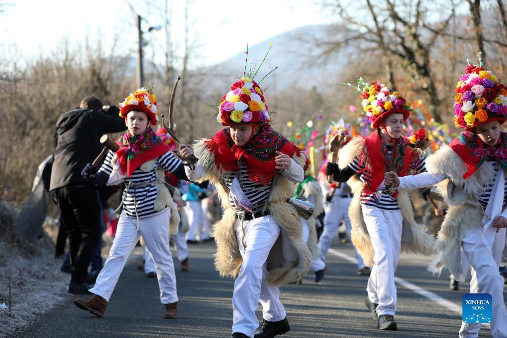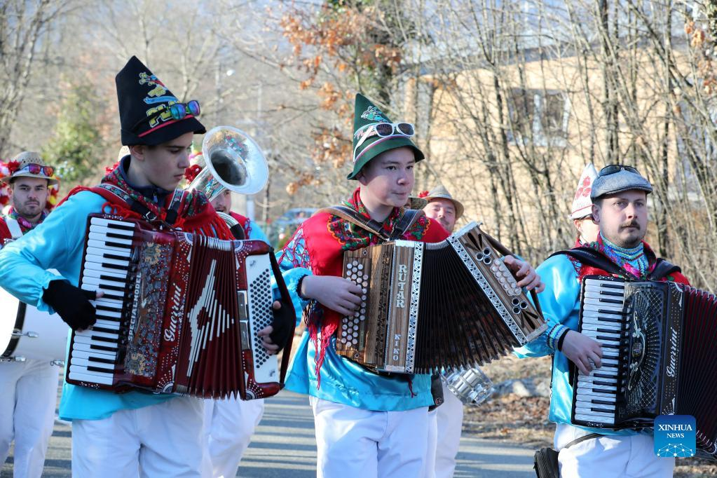 Bell ringers take part in a traditional Croatian carnival procession at Permani, Croatia on Feb. 13, 2022. (Goran Kovacic/PIXSELL via Xinhua)