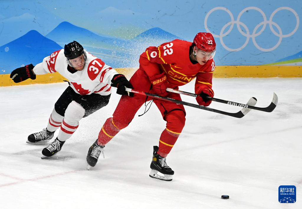 Fu Shuai (R) of China competes during the ice hockey men's preliminary round Group A match between China and Canada at National Indoor Stadium in Beijing, capital of China, Feb. 13, 2022. (Xinhua/Du Yu)