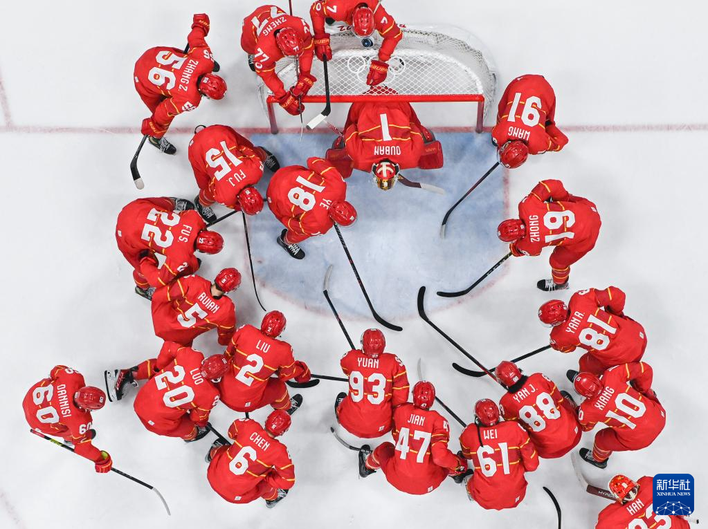 Athletes of China react during the ice hockey men's preliminary round Group A match between China and Canada at National Indoor Stadium in Beijing, capital of China, Feb. 13, 2022. (Xinhua/Du Yu)