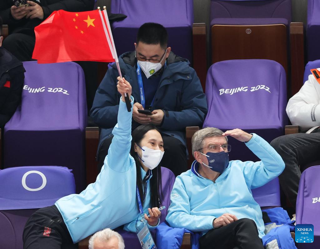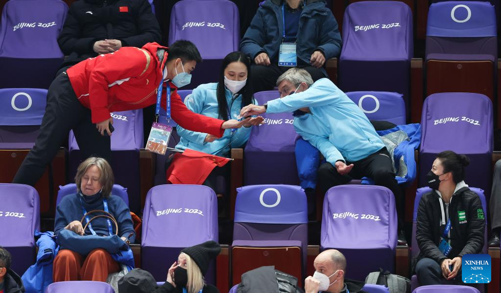 International Olympic Committee (IOC) president Thomas Bach (R) shares hand sanitizer with China's gold medalist Gao Tingyu (L) and IOC member Zhang Hong during short track speed skating events at Capital Indoor Stadium in Beijing, capital of China, Feb. 13, 2022. (Xinhua/Cao Can)