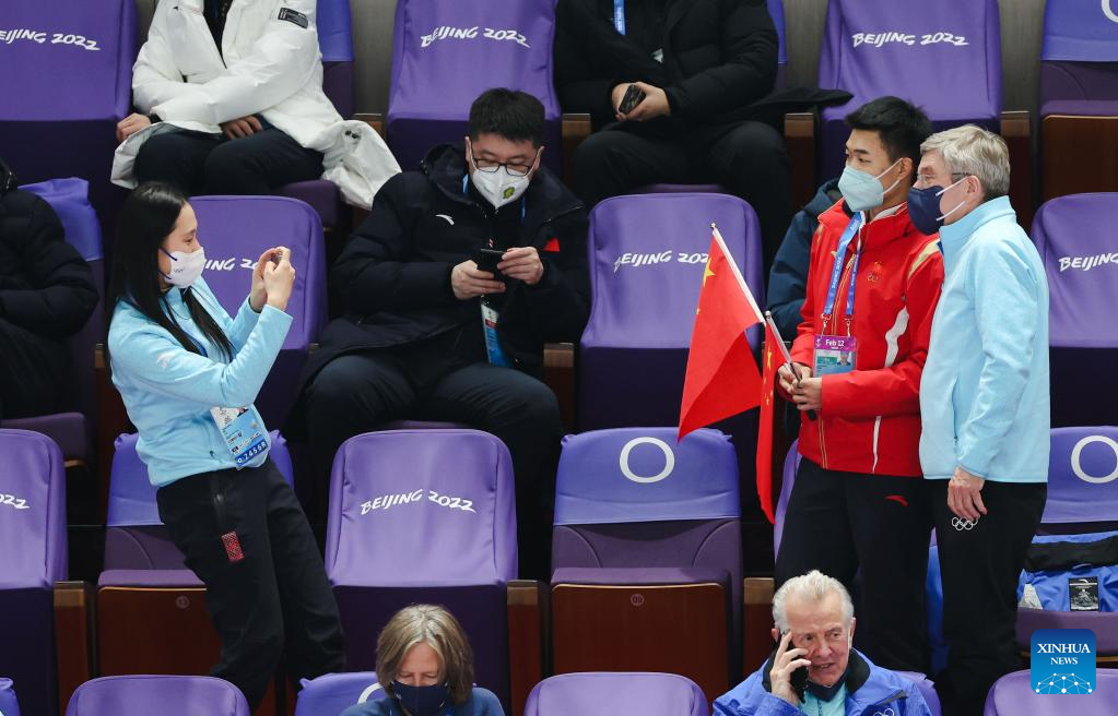 International Olympic Committee (IOC) member Zhang Hong (L) takes a photo for IOC president Thomas Bach (R) and China's gold medalist Gao Tingyu during short track speed skating events at Capital Indoor Stadium in Beijing, capital of China, Feb. 13, 2022. (Xinhua/Cao Can)