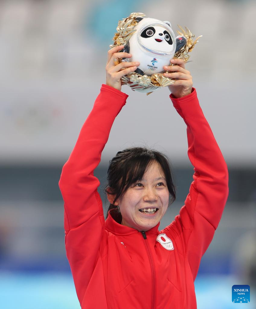 Takagi Miho of Japan celebrates after speed skating women's 500m at the National Speed Skating Oval in Beijing, capital of China, Feb. 13, 2022. (Xinhua/Ding Xu)