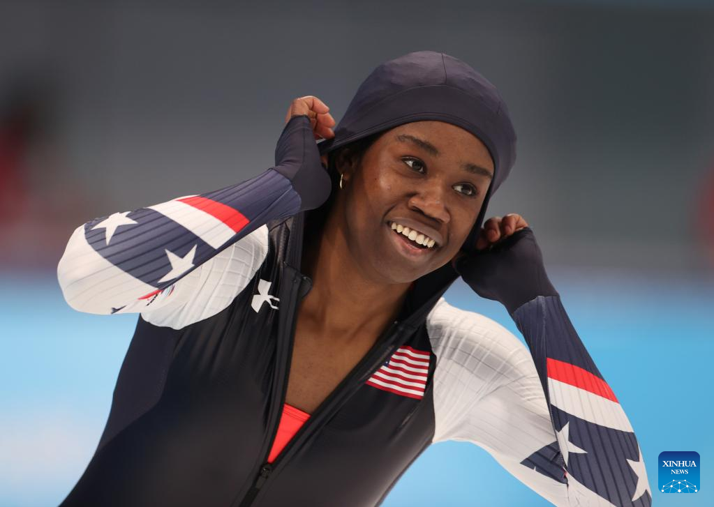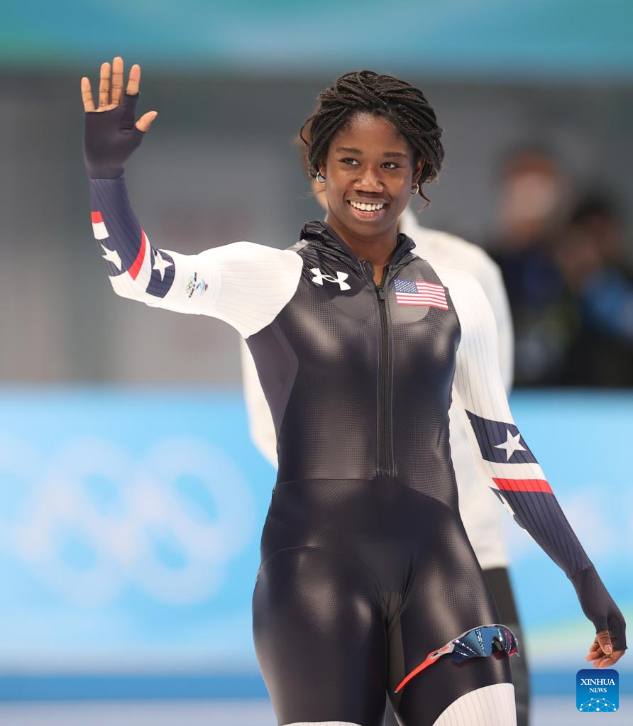 Erin Jackson of the United States poses after speed skating women's 500m at the National Speed Skating Oval in Beijing, capital of China, Feb. 13, 2022. (Xinhua/Wang Jianwei)