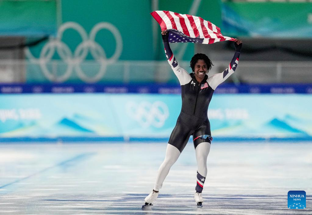 Erin Jackson of the United States celebrates after winning speed skating women's 500m at the National Speed Skating Oval in Beijing, capital of China, Feb. 13, 2022. (Xinhua/Wang Fei)
