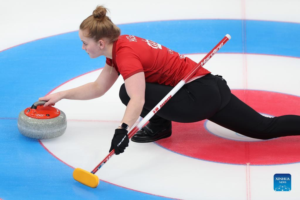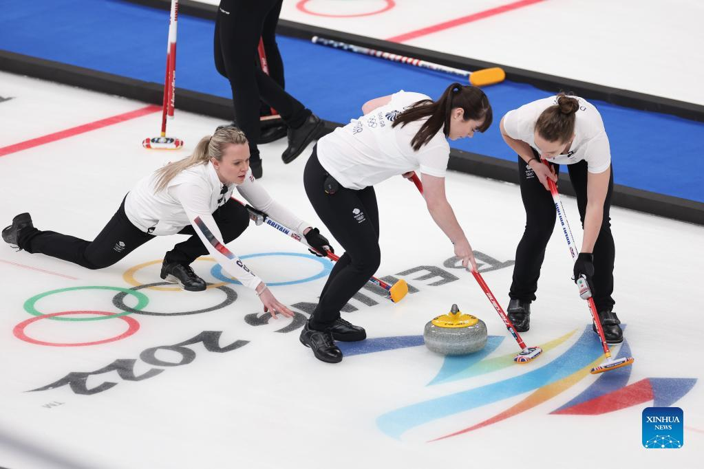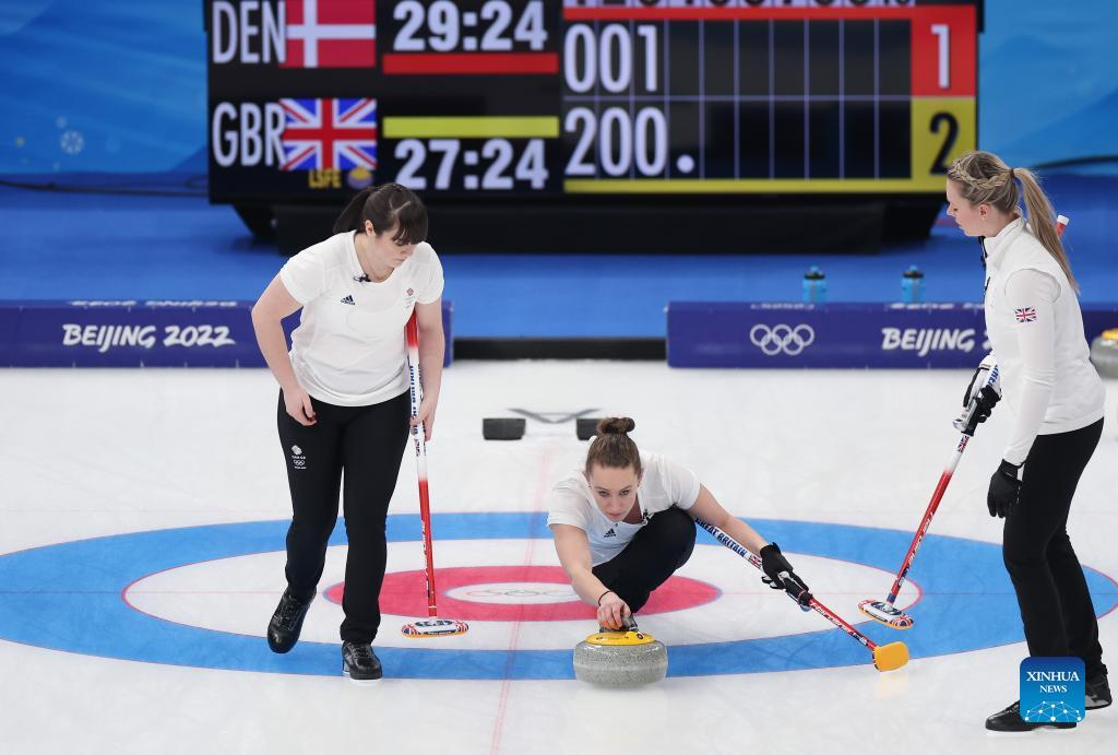 Jennifer Dodds (C) of Great Britain competes during the curling women's round robin session 6 of Beijing 2022 Winter Olympics between Great Britain and Denmark at National Aquatics Centre in Beijing, capital of China, Feb. 13, 2022. (Xinhua/Liu Xu)
