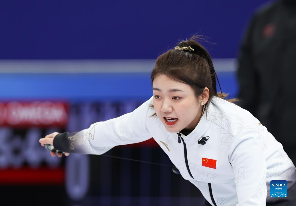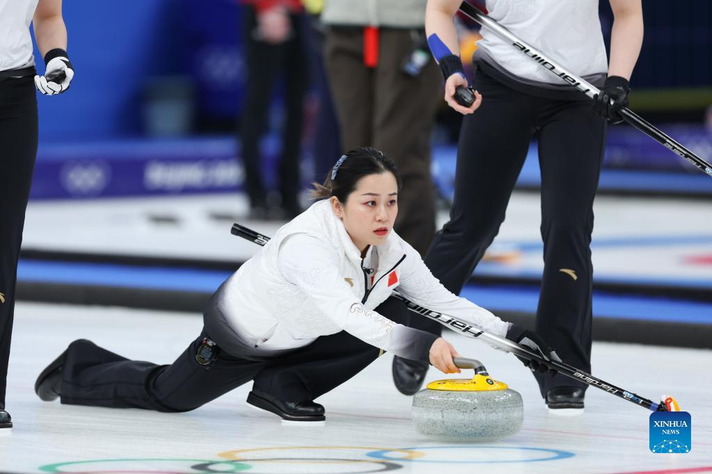 Wang Rui of China competes during the Curling Women's Round Robin Session 6 of the Beijing 2022 Winter Olympics between South Korea and China at the National Aquatics Centre in Beijing, capital of China, Feb. 13, 2022. (Xinhua/Wang Jingqiang)