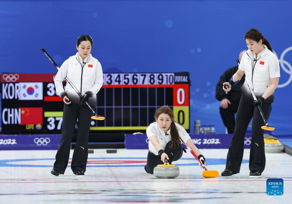 Han Yu of China competes during the Curling Women's Round Robin Session 6 of the Beijing 2022 Winter Olympics between South Korea and China at the National Aquatics Centre in Beijing, capital of China, Feb. 13, 2022. (Xinhua/Wang Jingqiang)