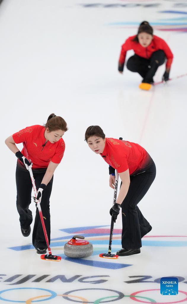 Dong Ziqi (R front) and Zhang Lijun (L front) of China compete during the curling women's round robin session 7 of Beijing Winter Olympics between China and Japan at National Aquatics Centre in Beijing, capital of China, Feb. 14, 2022. (Xinhua/Zhou Mi)