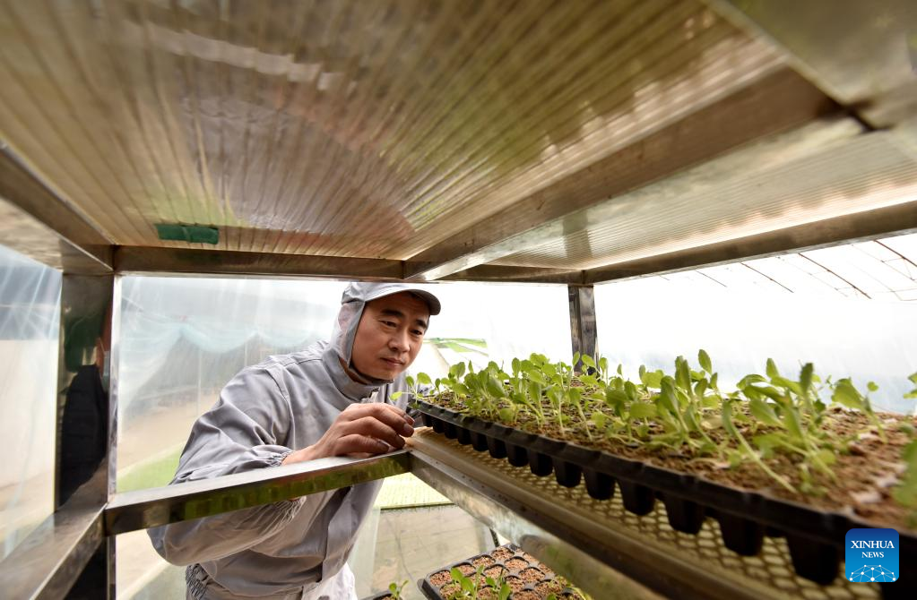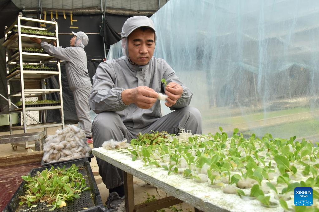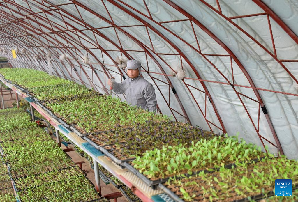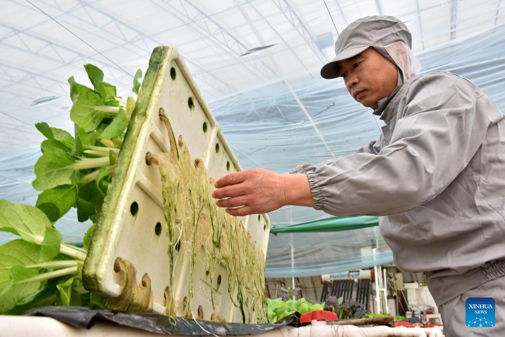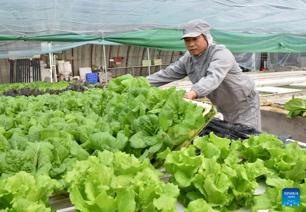 Farmer Zhang Zhaoke works in a hydroponic farming greenhouse in Xingtai, north China's Hebei Province, Feb. 12, 2022. In 2020, Zhang invested in a hydroponic farming business which produces greenhouse vegetables. (Xinhua/Zhu Xudong)